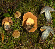 Einer von vielen Mykorrhizapilzen der Lärche ist dieser wunderschön gefärbte Goldröhrling. Jung ist der Hut fast kugelig, breitet er sich flach aus und wird bis zu 12 cm breit. Auch bei trockenem Wetter ist die Huthaut leicht klebrig, das Fleisch ist hellgelb und riecht würzig.